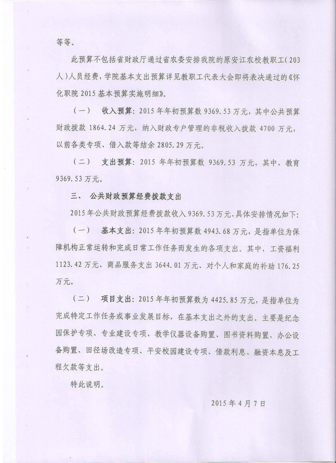 怀化职业技术学院2015年部门预算说明