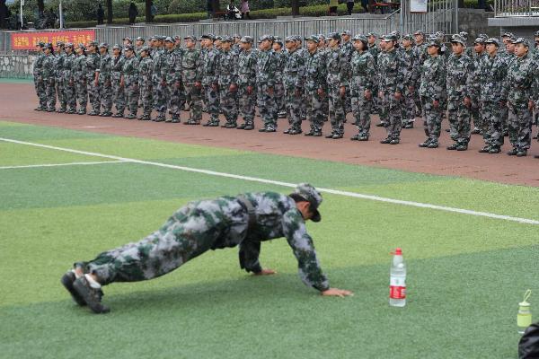 这是一个在训练时头乱动的男生,他被教官单独拉出来做惩罚,并且快速跑到指定的地点做20个俯卧撑,他丝毫没有犹豫,认真并且标准的完成了教官给他的惩罚。在这个看似很完美的惩罚背后其实隐藏了一个故事,他从早上开始肚子就痛得不行,本来是坐着休息,但没过20分钟又回到训练当中,他为了心中那份执着,不顾自己的身体坚持下去。所以他没有埋怨,做完惩罚继续回到部队当中。我相信每一个同学都可以在这次军训中获得用钱都买不来的“宝藏”。